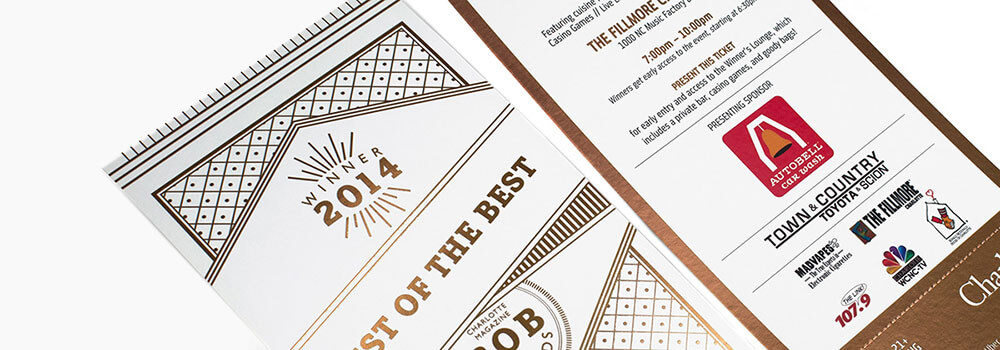 Inline foil (also known as Cold Foil) is a simple and affordable way to make your prints stand out from the crowd. With Inline Foil, you can turn a wide range of CMYK colors into multi-colored foils. Inline Foil uses a unique processed foil system that is applied under the 4-color process print to create an array of foil colors.