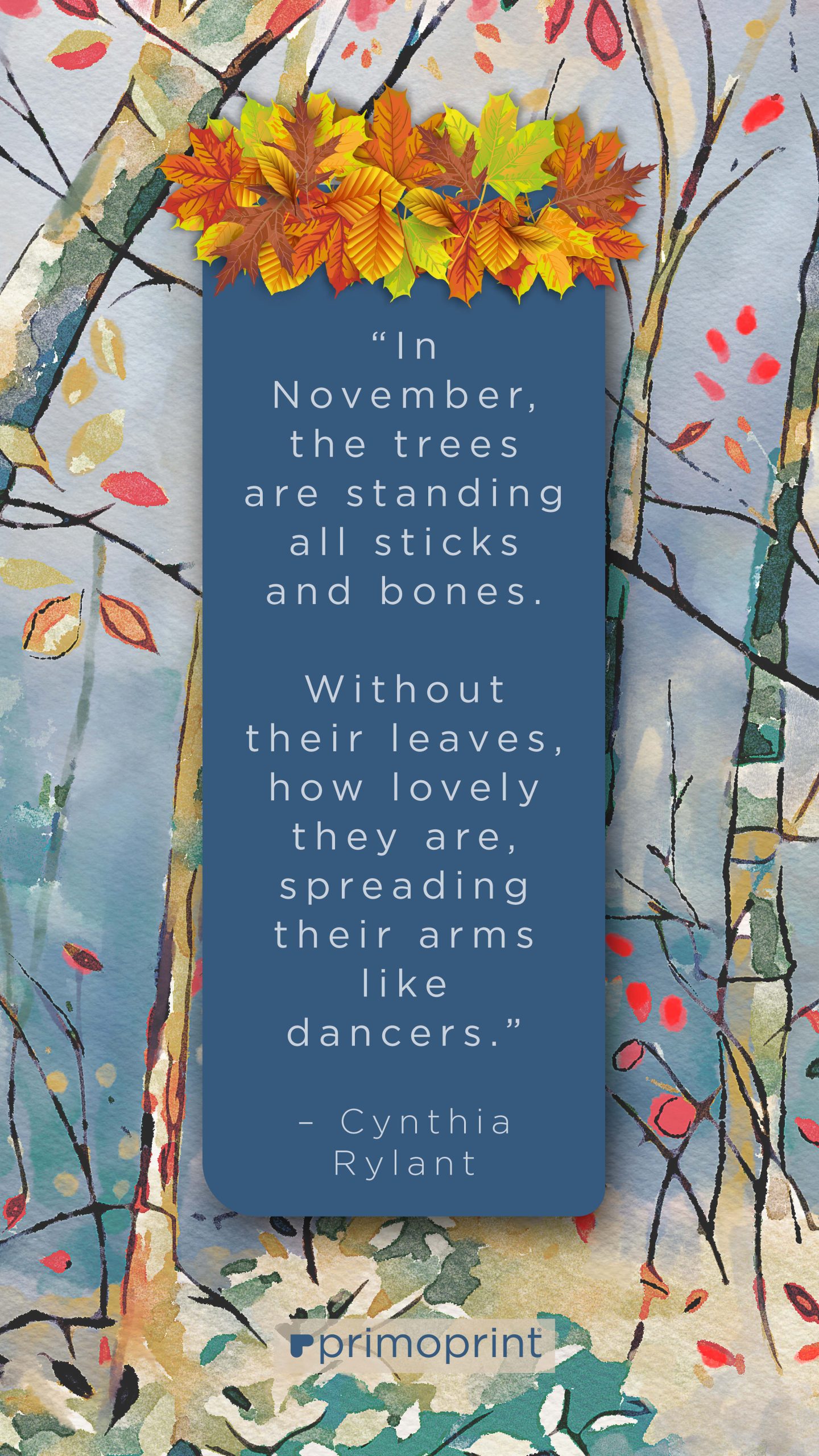 “In November, the trees are standing all sticks and bones. Without their leaves, how lovely they are, spreading their arms like dancers.” – Cynthia Rylant